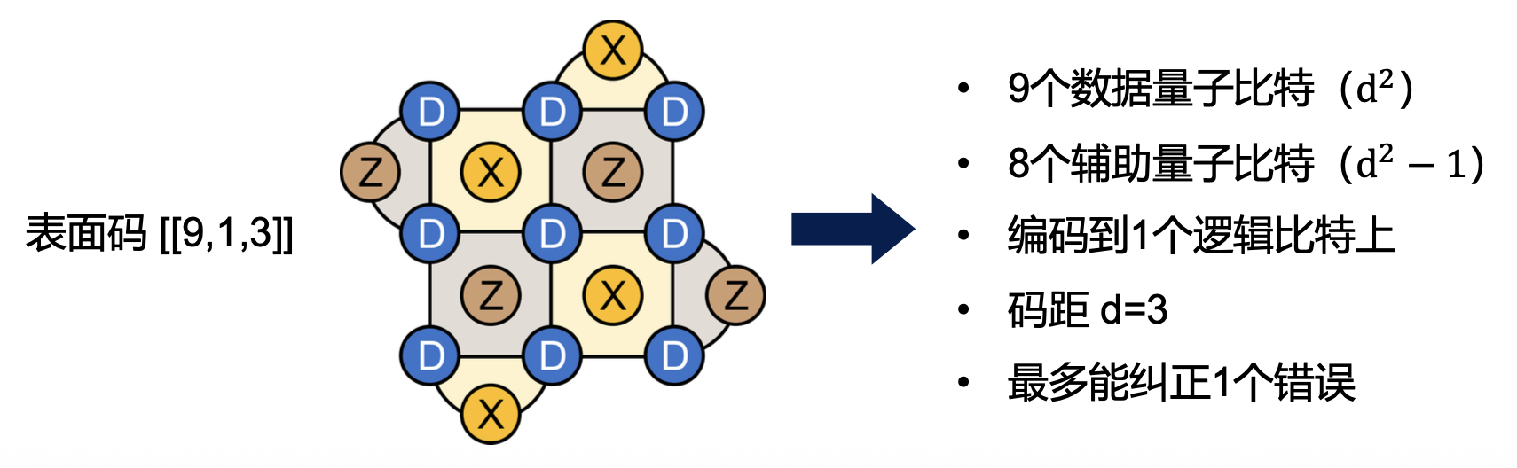 - d:所形成的逻辑比特的码距,用来衡量纠错能力,最多能纠正 \(\lfloor \dfrac{d-1}{2} \rfloor\) 个错误(向下取整)