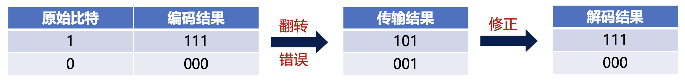 - 重复码通过冗余编码提高了抗噪性能;若信道中发生错误,解码器能以高概率判断出正确的原始比特