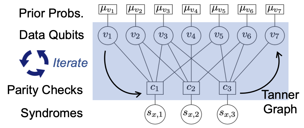 - BP 在 Tanner 图上传递消息,迭代更新数据比特出错的概率值,从而确定最有可能的错误模式