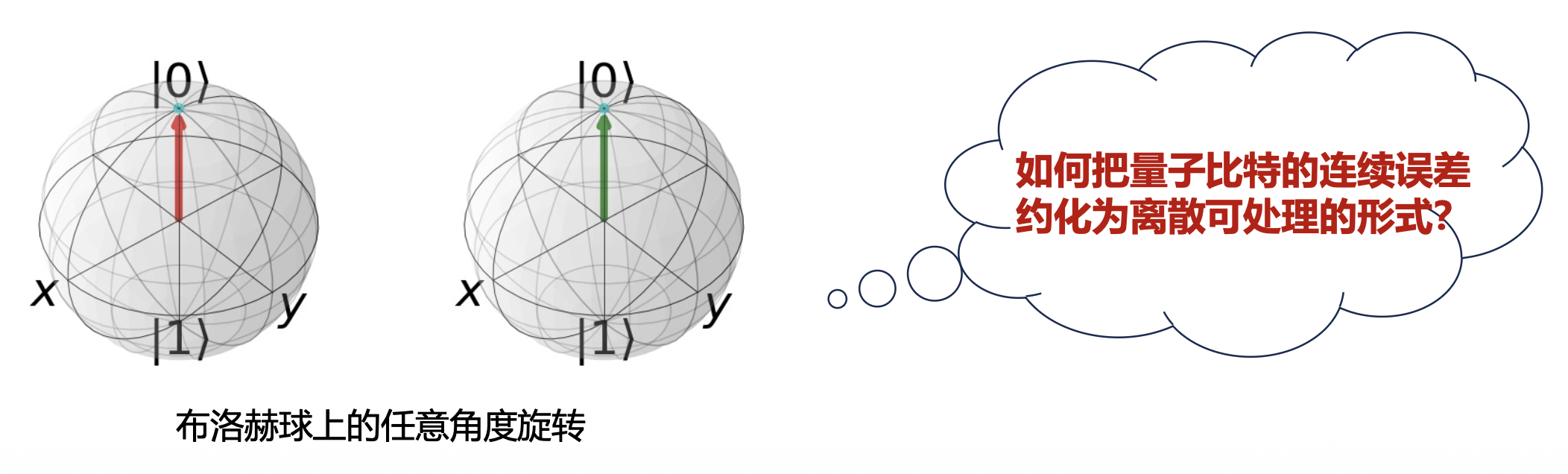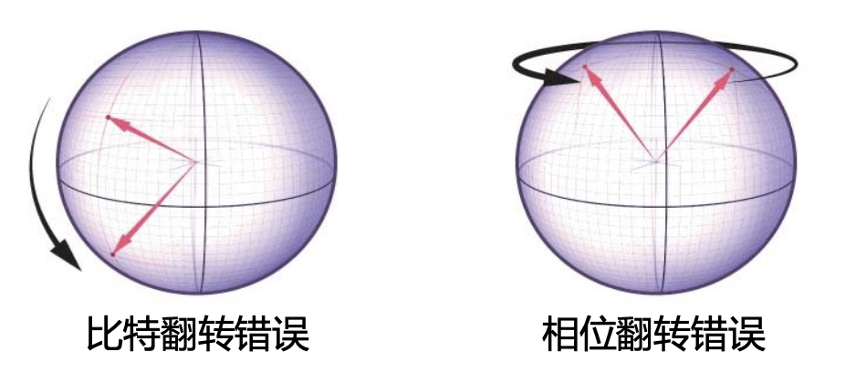 - 误差类型不同:经典错误通常是 0 和 1 之间的的离散跳变,而量子比特的错误可以表现为 Bloch(布洛赫)球上的连续扰动,即任意角度的旋转