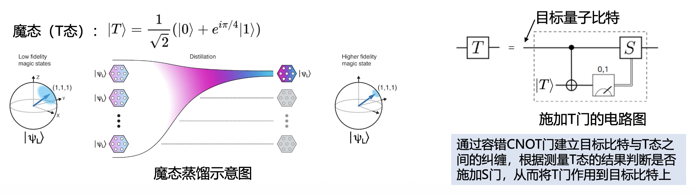 ) :主要挑战,因为 T 门通常不能以横向方式实现,其容错实现更为复杂。当前主要通过魔态蒸馏(magic state distillation) 的方式来实现 T 门