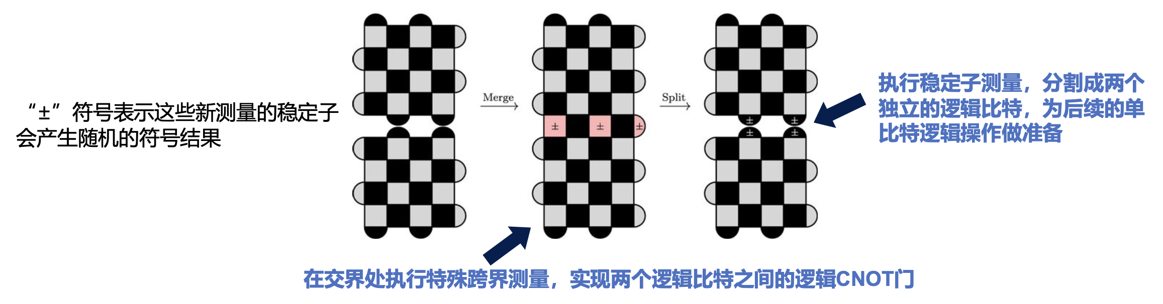 - 格子手术(lattice surgery) 解决了这个问题,它不直接连接所有物理比特,而是通过合并和分裂操作,对表面码的边界进行重新定义和测量