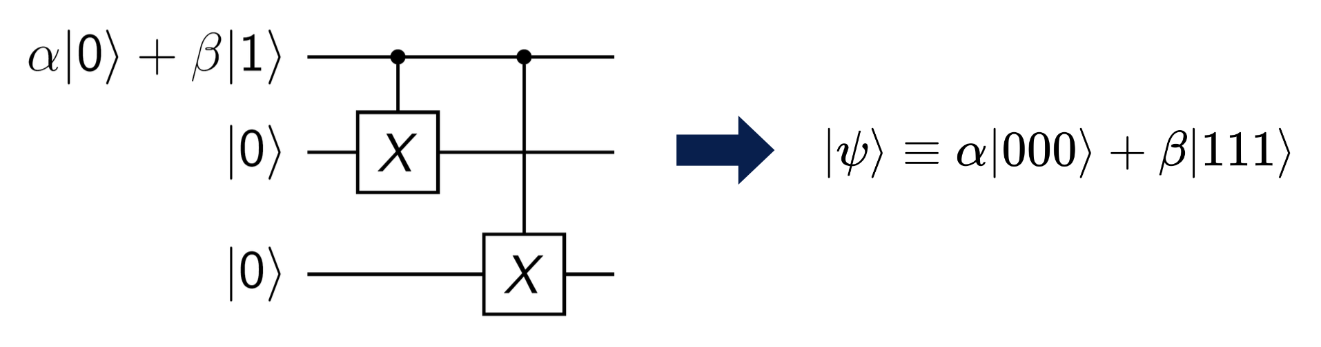 准备过程:我们用如图的量子电路编码 3 个数据比特,通过两个 CNOT 门使其处于纠缠态,即: