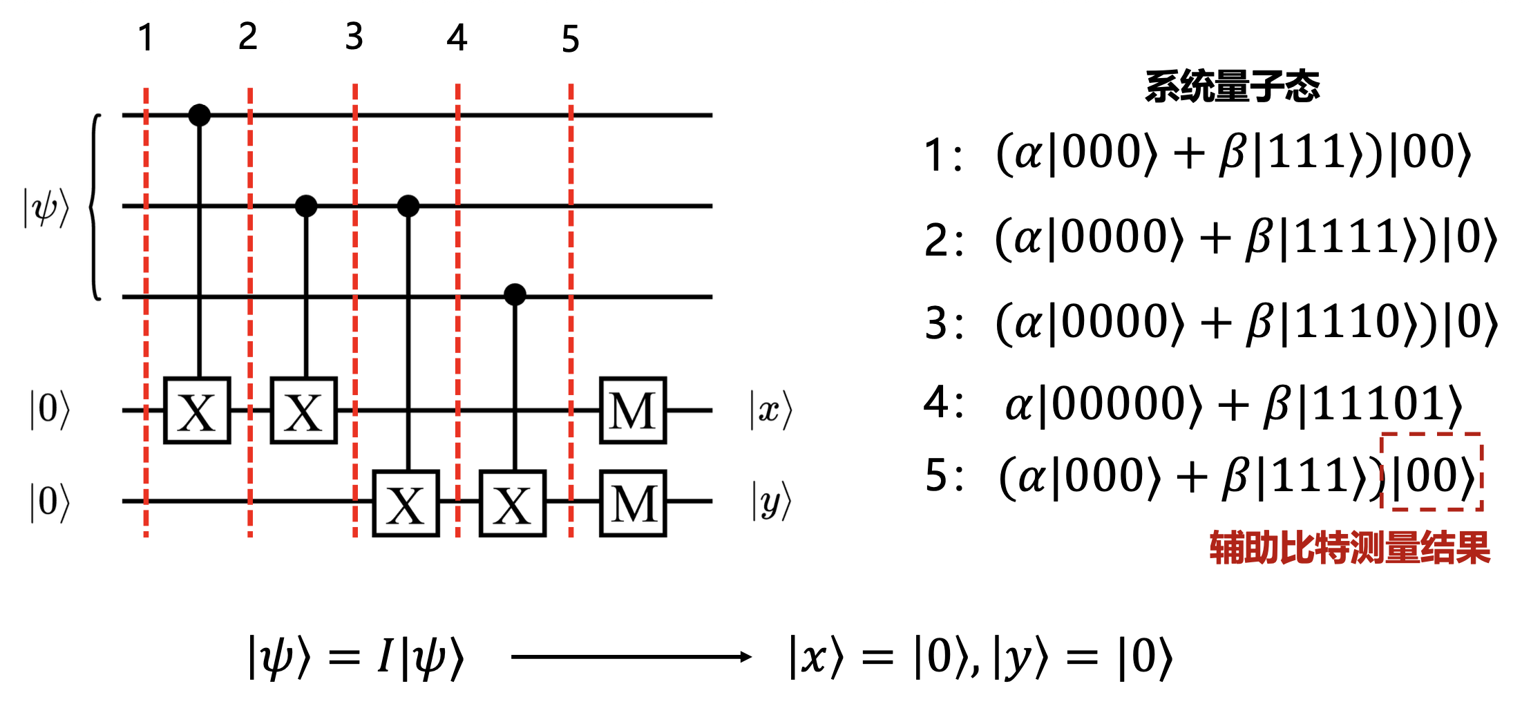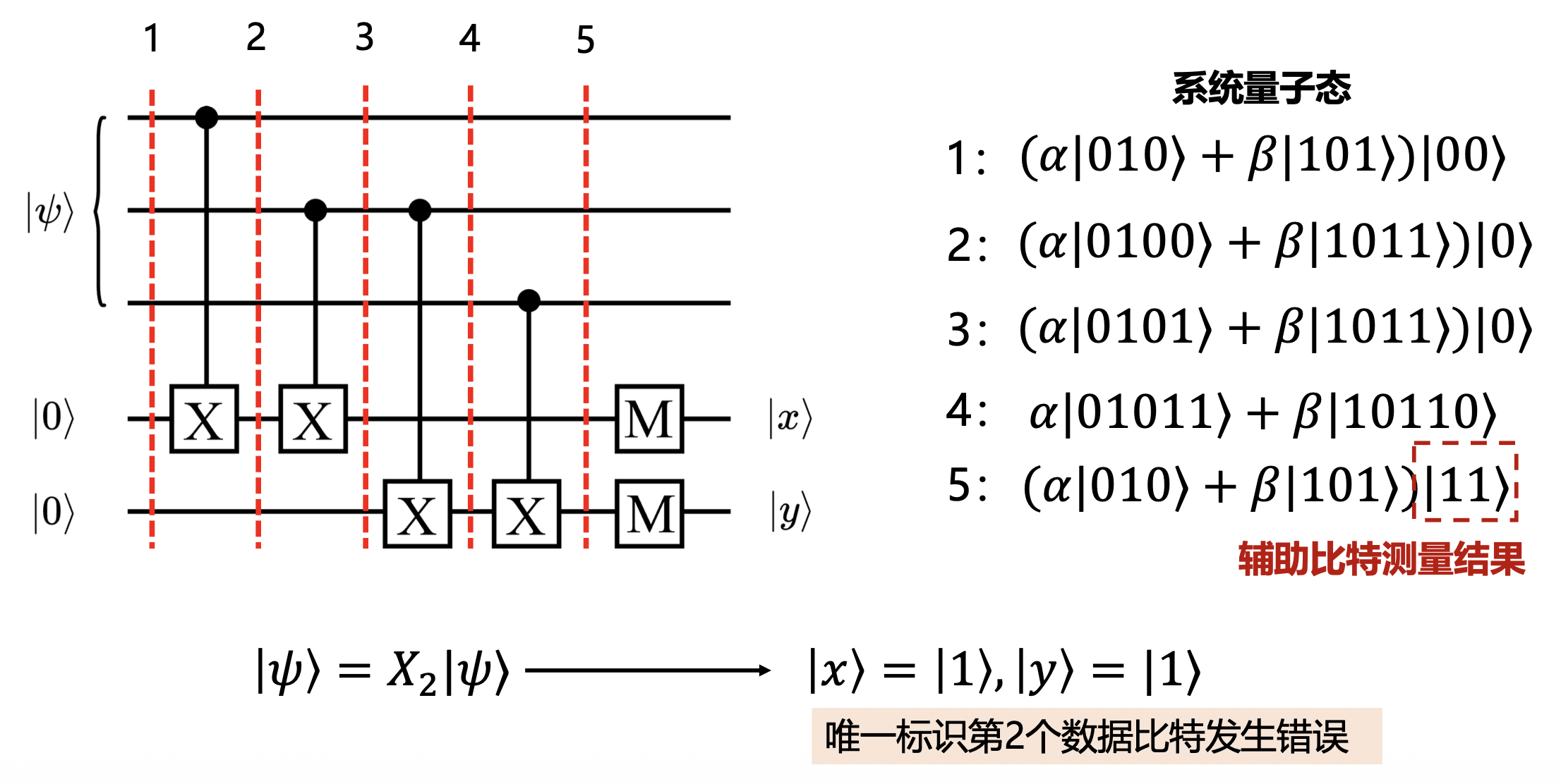 | 翻转一个数据比特 | \(\alpha\|010\rangle + \beta\|101\rangle\) \(\alpha\|001\rangle + \beta\|110\rangle\) \(\alpha\|100\rangle + \beta\|011\rangle\) |