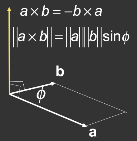 - 笛卡尔公式:\(\vec{a} \times \vec{b} = A^* \vec{b} = \begin{pmatrix}0 & -z_a & y_a \\ z_a & 0 & -x_a \\ -y_a & x_a & 0\end{pmatrix} \begin{pmatrix}x_b \\ y_b \\ z_b\end{pmatrix} = \begin{pmatrix}y_a z_b - y_b z_a \\ z_a x_b - x_a z_b \\ x_a y_b - y_a x_b\end{pmatrix}\)