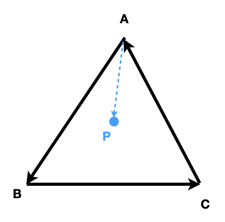 假定三角形三条边对应的向量按逆时针方向排列。先看 \(\overrightarrow{AB}\) 和 \(\overrightarrow{AP}\),\(\overrightarrow{AB} \times \overrightarrow{AP}\) 的结果是垂直纸面向外的,因此 \(P\) 点在 \(AB\) 的左侧。同理可得 \(P\) 点也在 \(BC, CA\) 的左侧,因此 \(P\) 点在三角形内部。