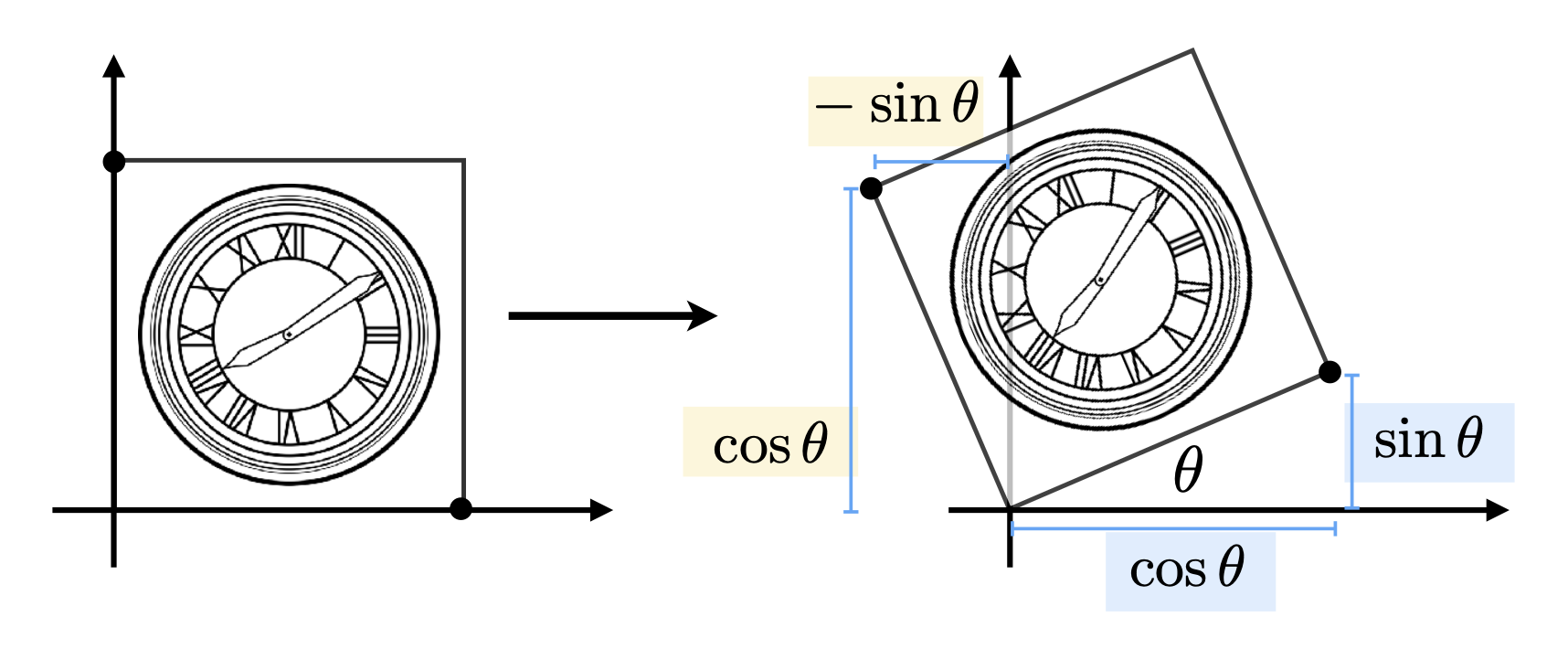 - 假设原图形(左图)边长为 1,旋转矩阵 \(R_\theta\) 的 4 个元素均为未知数,即 \(R_\theta = \begin{bmatrix}A & B \\ C & D\end{bmatrix}\)