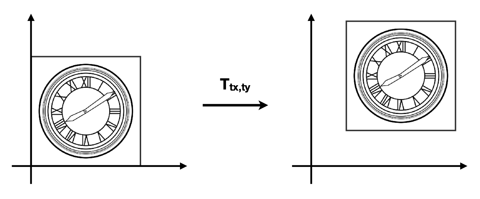 还有一种叫做平移(translation) 的简单变换,方程为:\(\begin{cases}x' = x + t_x \\ y' = y + t_y\end{cases}\)。