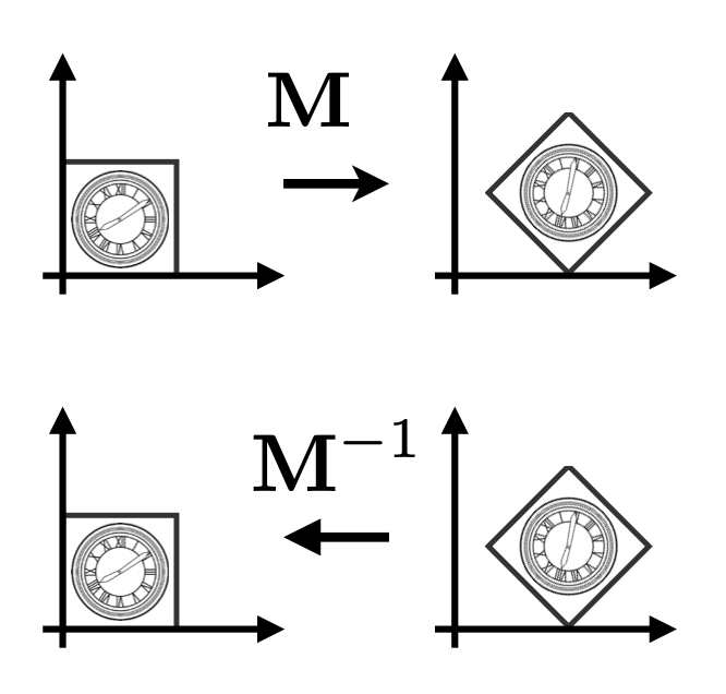 矩阵 \(M^{-1}\) 就是变换矩阵 \(M\) 的逆变换(inverse transform)。
