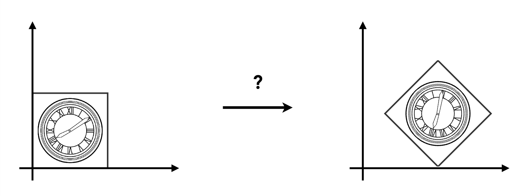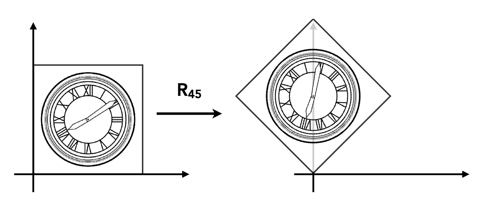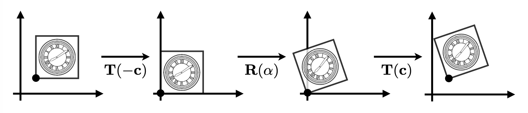 上图所示的变换可无法用前面介绍过的任何一个单独的变换表述,所以这是一种复合变换(composite transform)。不难发现,该变换既包括平移,也包括旋转。