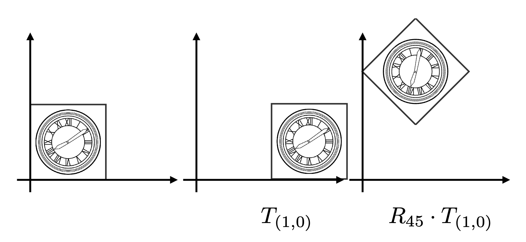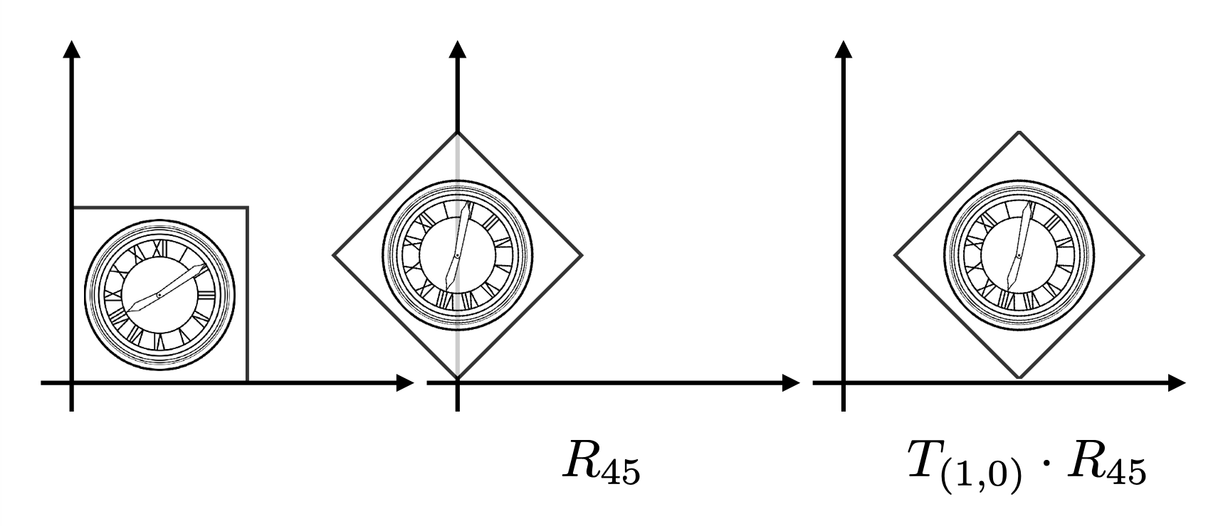 这给我们带来的启示是:变换的顺序很重要!从数学上来说,这是因为矩阵乘法不具备交换律,因此 \(R_{45} \cdot T_{(1, 0)} \ne T_{(1, 0)} \cdot R_{45}\),因此不同的变换顺序会带来不同的结果。