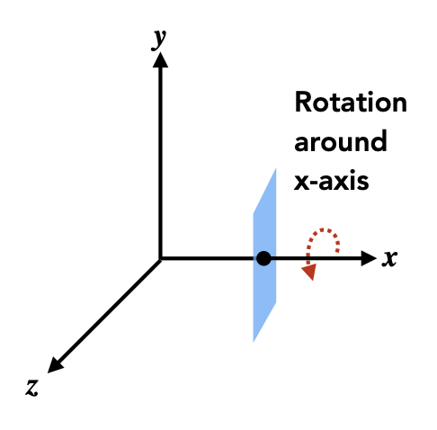 \[ \mathbf{R}_x(\alpha) = \begin{pmatrix}1 & 0 & 0 & 0 \\ 0 & \cos \alpha & - \sin \alpha & 0 \\ 0 & \sin \alpha & \cos \alpha & 0 \\ 0 & 0 & 0 & 1\end{pmatrix} \] -