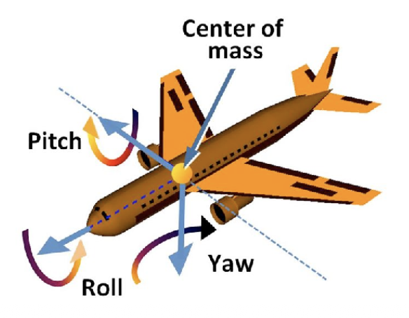 - 俯仰 (pitch):飞机绕着机翼横轴(从一侧机翼到另一侧机翼)上下摆动的运动