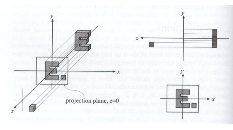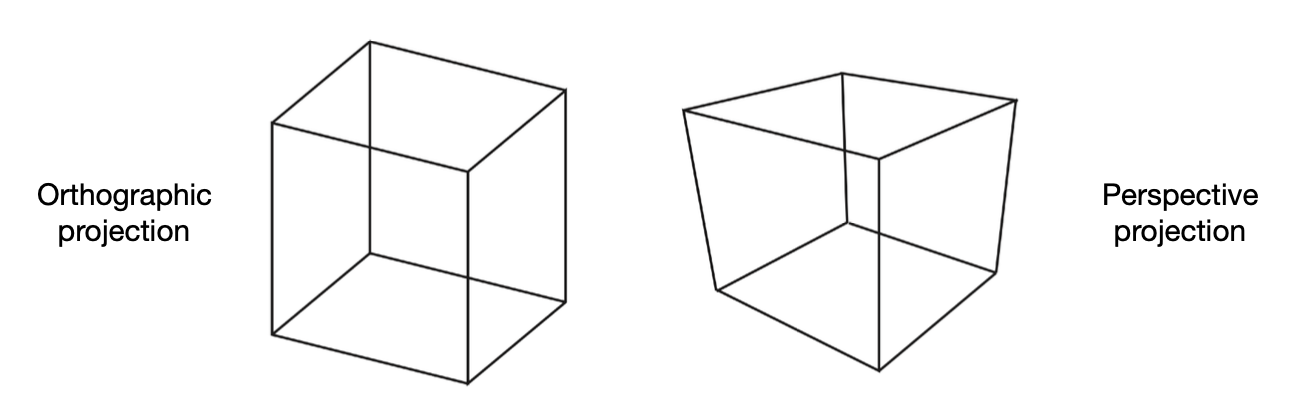 - 正射投影(orthographic projection):常用于工程制图,无近大远小的现象