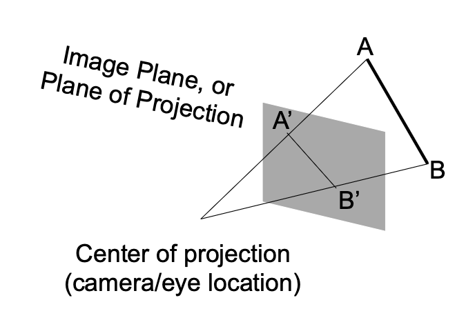 - 透视投影(perspective projection):近大远小;延伸立方体上的所有边,发现一些直线会汇聚于一点(学过素描的都知道)