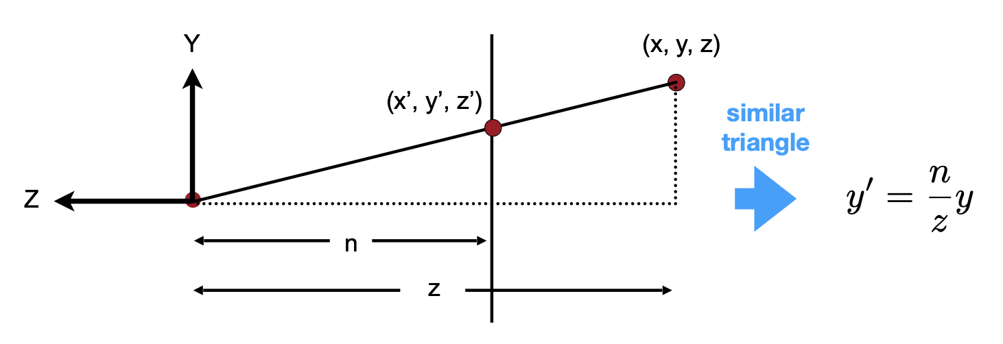 根据相似三角形的性质,\(y' = \dfrac{n}{z} y, x' = \dfrac{n}{z} x\)。用齐次坐标表示如下: