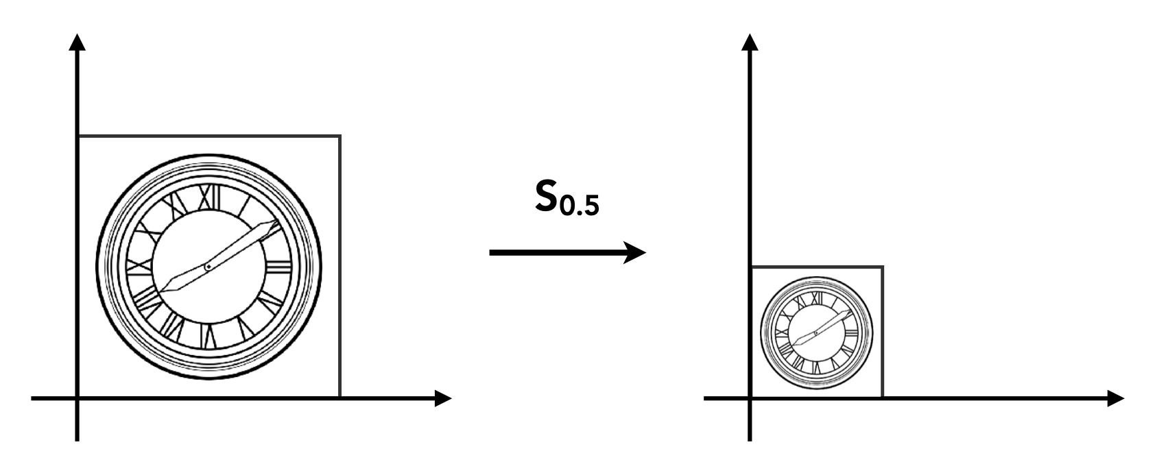 现在图形上的坐标为:\(\begin{cases}x' = sx \\ y' = sy\end{cases}\)。我们可将这一缩放(scaling) 变换表示成矩阵 - 向量乘法: