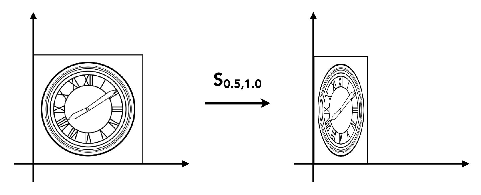 \[ \mathbf{S}(s_x, s_y) = \begin{pmatrix}s_x & 0 & 0 \\ 0 & s_y & 0 \\ 0 & 0 & 1\end{pmatrix} \] -