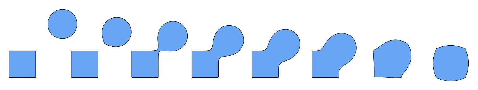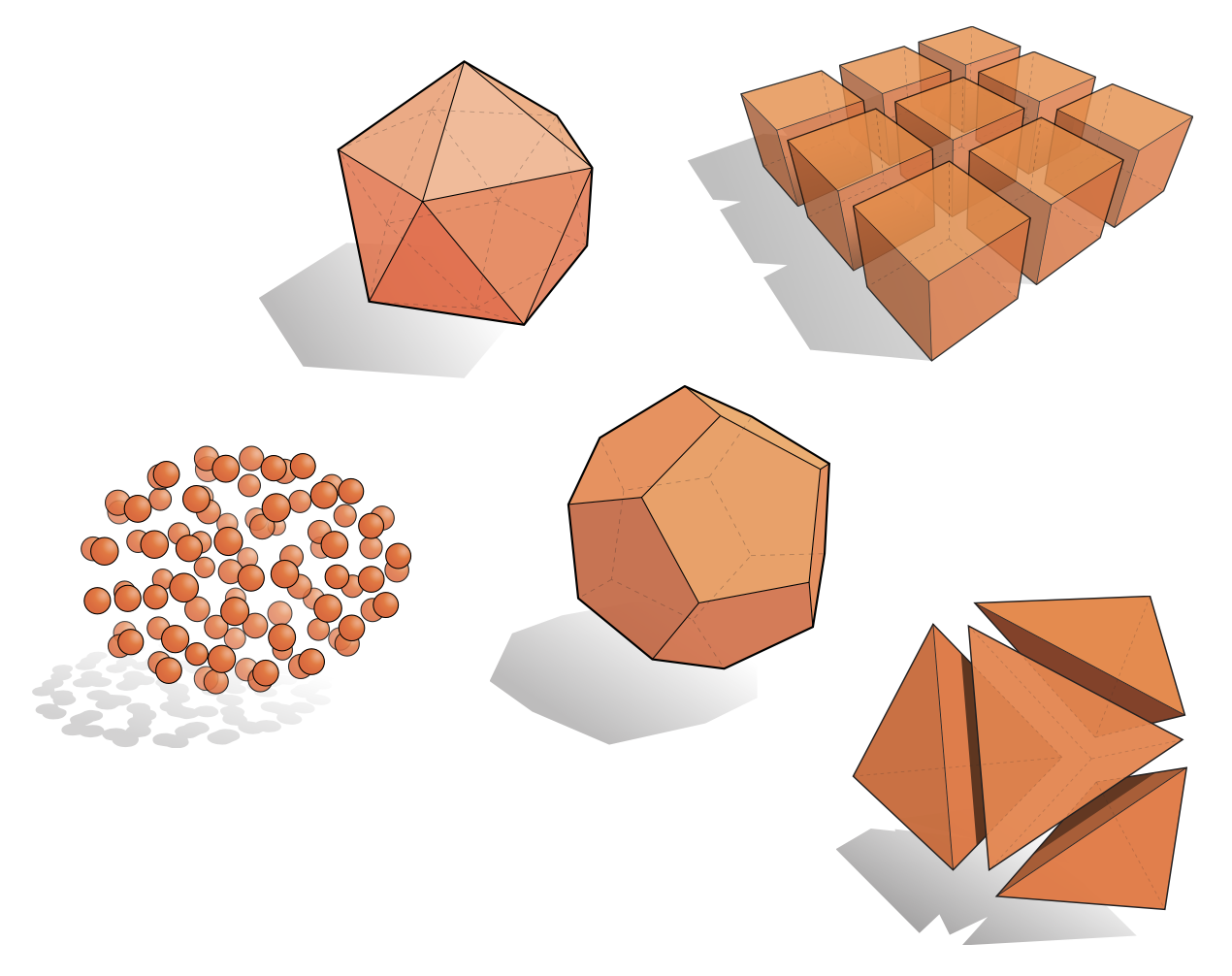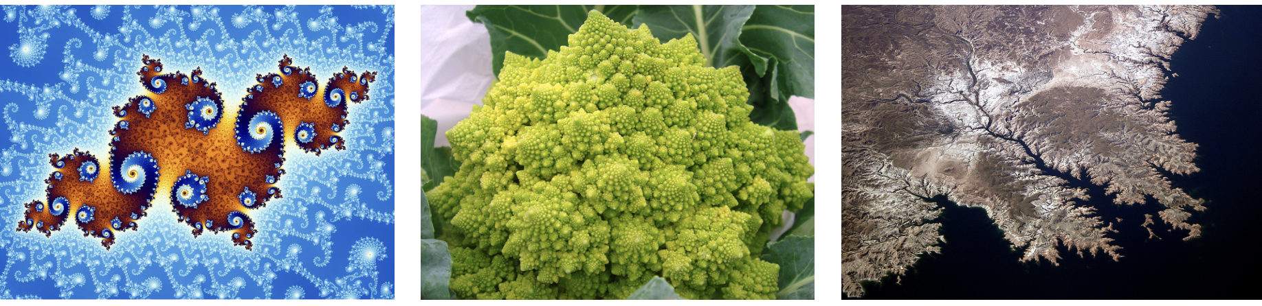 分形(fractals) 的特点是自相似,即部分和整体长得非常像,类似递归函数。自然界中不少现象和分形有关。但这样的形状难以控制。