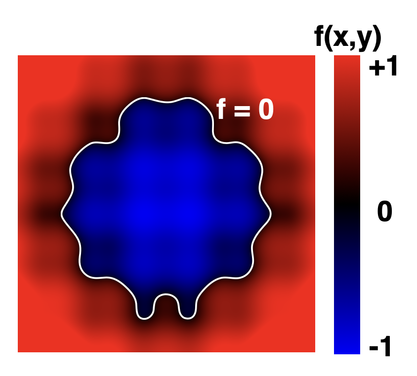 一些任务很难用这种隐式法表示。然而,隐式法擅长的是区分一个点在几何体的内部还是外部。比如检验点 \((3/4, 1/2, 1/4)\) 是否在几何体 \(f(x, y, z) = x^2 + y^2 + z^2 - 1\) 的内部时,只需将坐标值带进去计算,看函数值的正负即可。由于结果为 \(-1/8 < 0\),因此该点在几何体的内部。