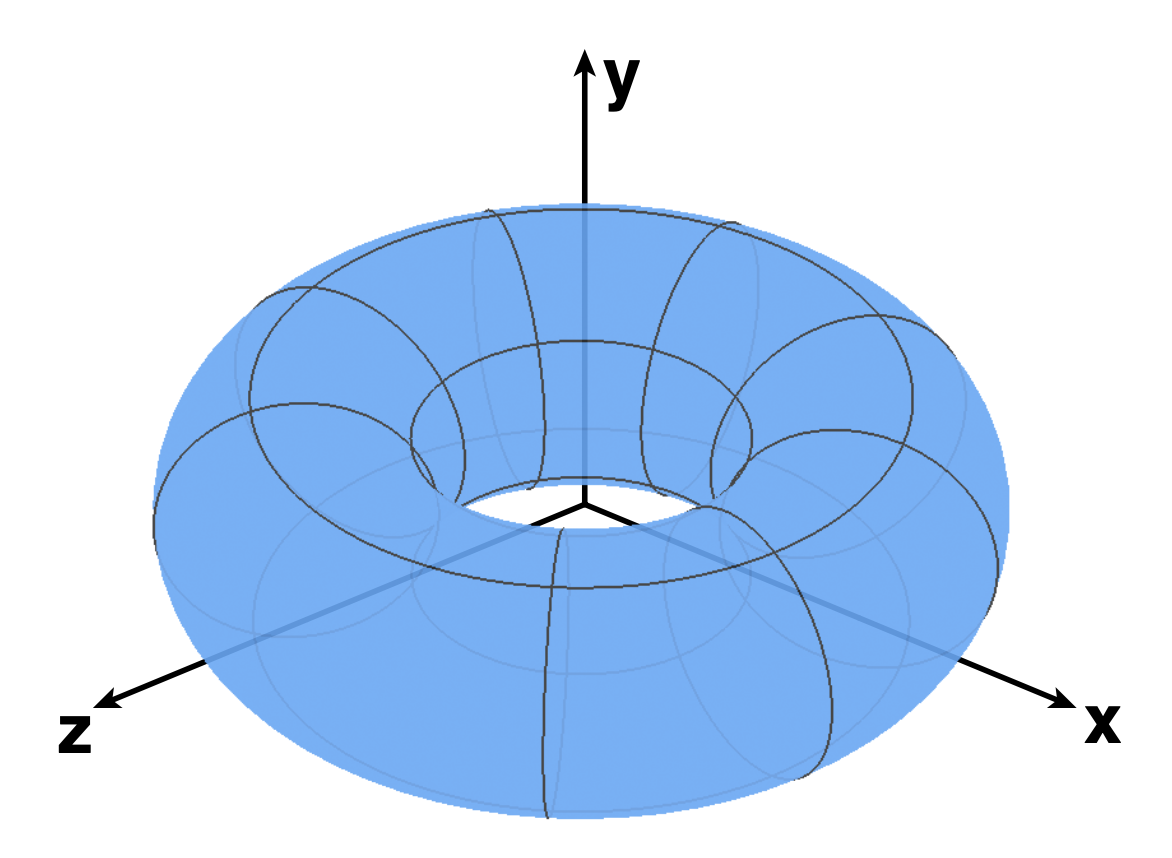 可以用方程表示更复杂的几何体——比如 \(f(x, y, z) = (2 - \sqrt{x^2 + y^2})^2 + z^2 - 1 = 0\) 可以表示在圆环上的点。