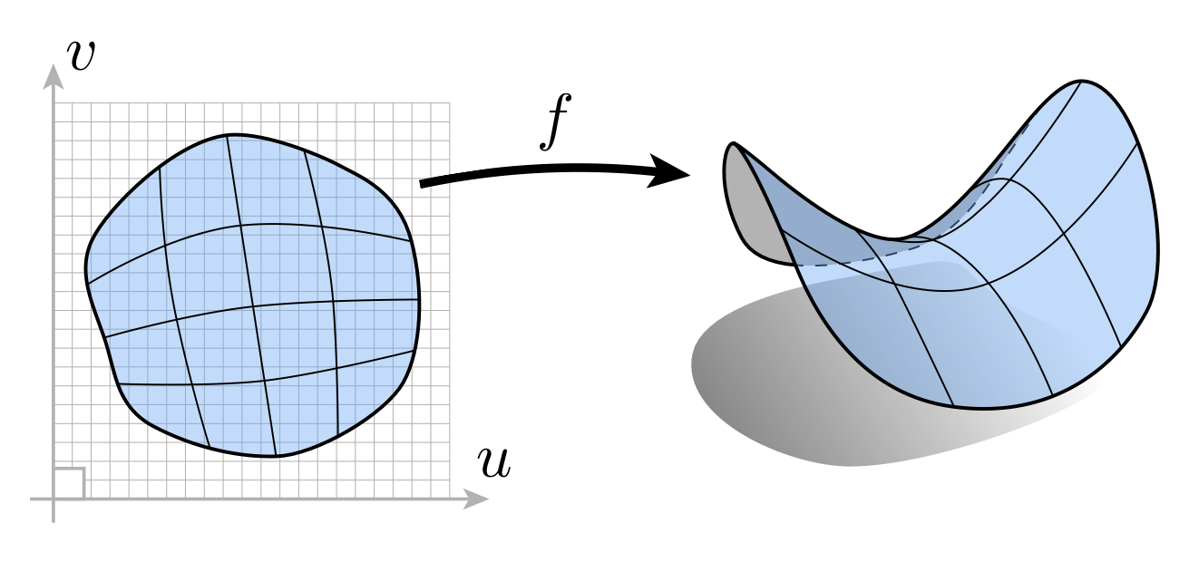 - 输出:由在 \([0, 1]^2\) 内被 \((u, v)\) 参数化的二维曲面