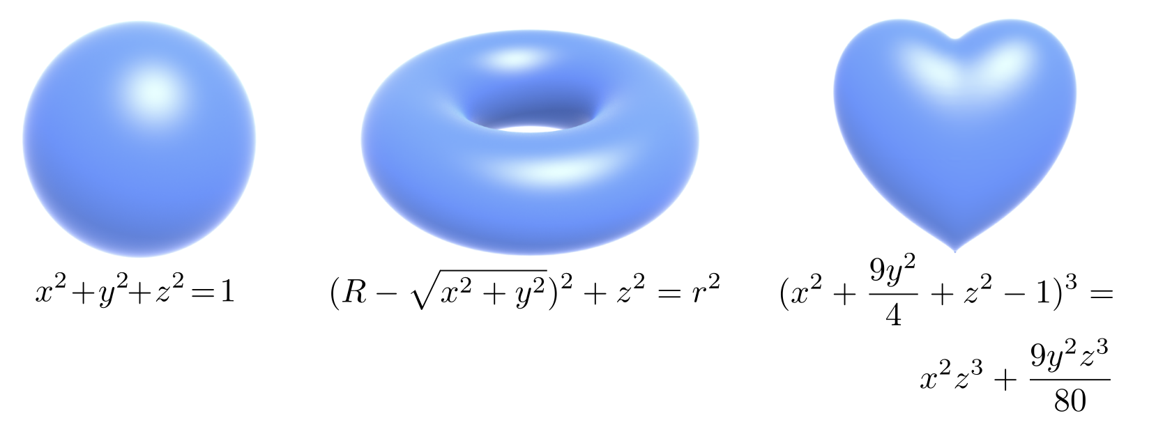 对于简单的几何体,可以直接用关于 x, y, z 的多项式表示。几何体的表面就是多项式的零集合。