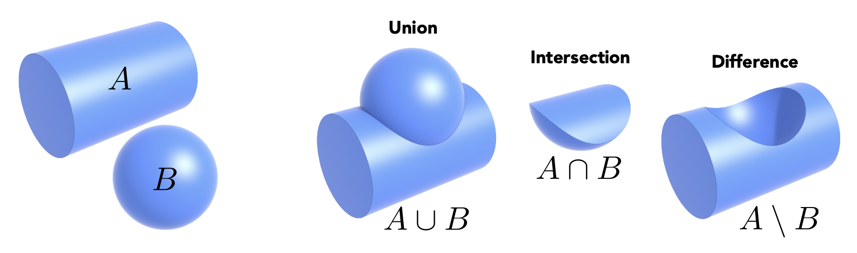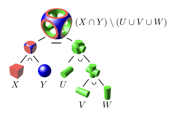 而对于复杂的形体,我们可以尝试结合多个隐式表示的几何体(利用布尔运算)来构造复杂几何体,这种方法叫做构造实体几何(constructive solid geometry)。