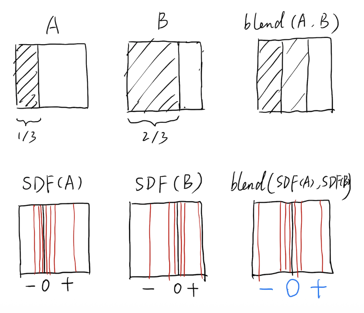另一种组合简单几何体的方法是使用距离函数(distance function) 逐渐混合两个几何体的表面。距离函数能提供从任意位置到物体的最小距离(可为有符号距离