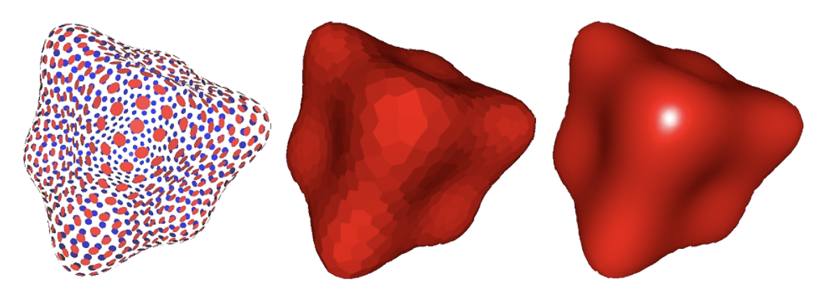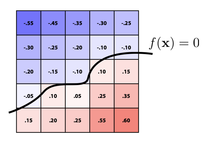 上述方法的局限性在于:一个封闭形式的函数很难描述所有复杂的形体。因此这里给出另一种解决方案:用网格存储一系列近似函数值。随后可用前面介绍过的插值法找出函数值 = 0 的地方,这些地方就是几何体的表面。这种方法能为我们提供更显式的形体控制(就像一个纹理
