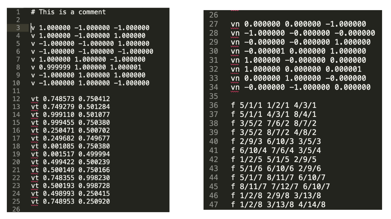 - 该文件是一种文本文件,指定顶点、法线、纹理坐标系,以及它们的连通性(connectivities)