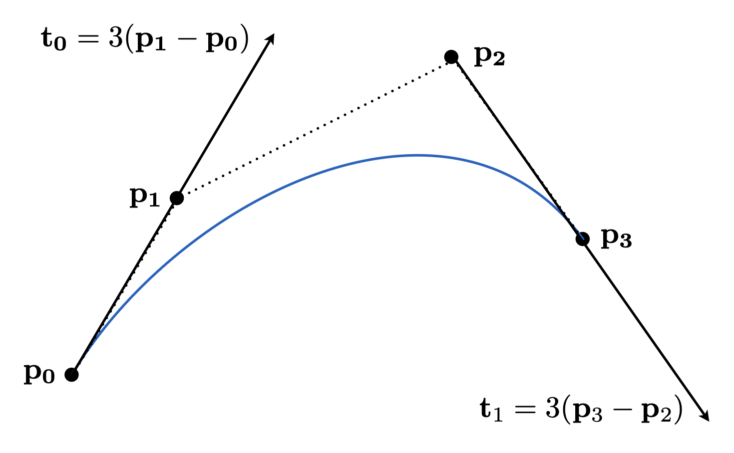 - 起点和终点处的切线方向是固定的,分别是从起点到第二个点的向量(\(\bm{t_0}\)