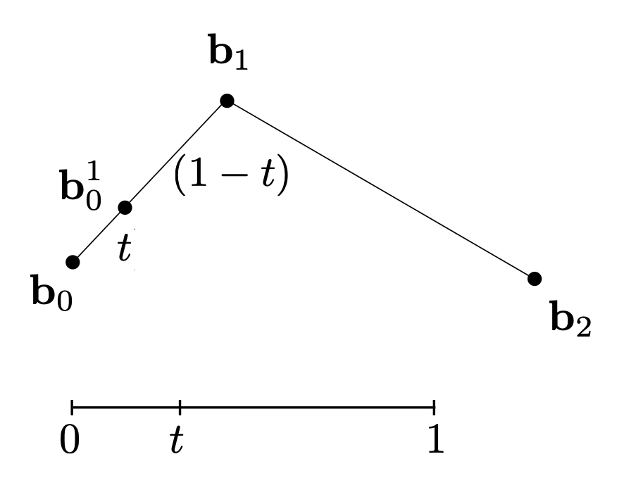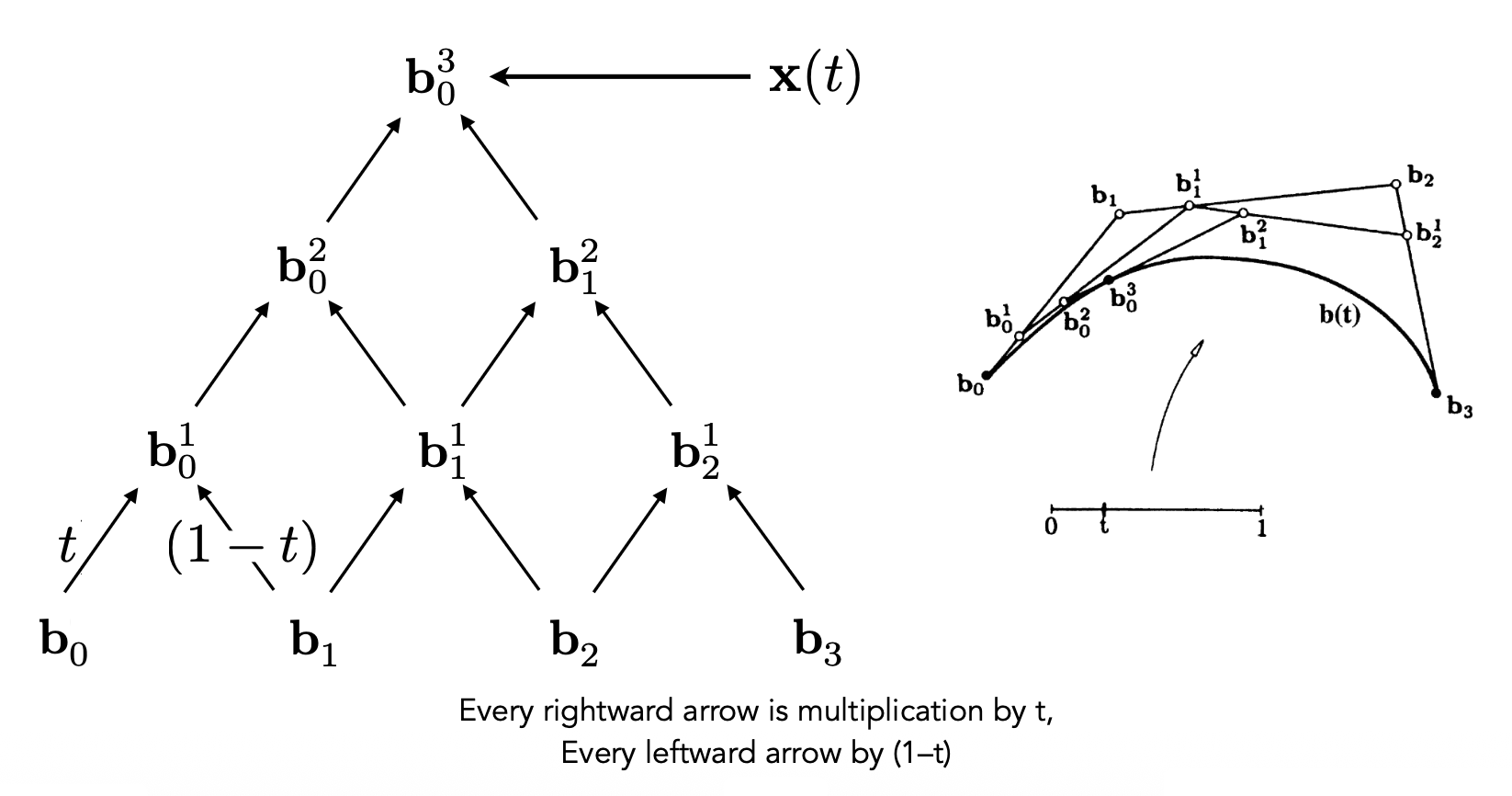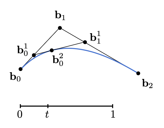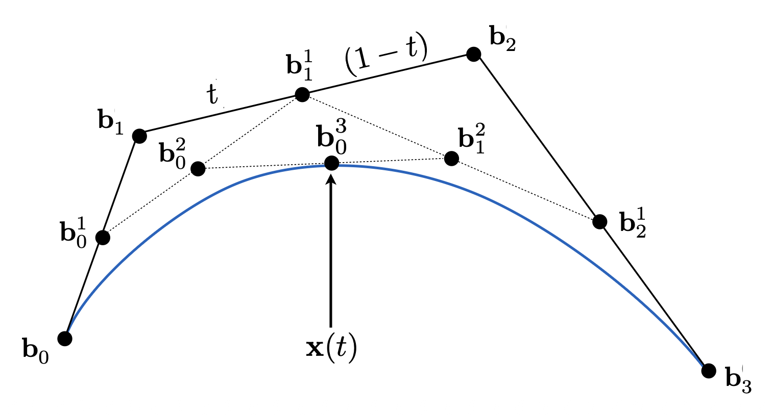 - 对于三次贝塞尔曲线,\(\bm{b}(0) = \bm{b}_0, \bm{b}(1) = \bm{b}_3\)