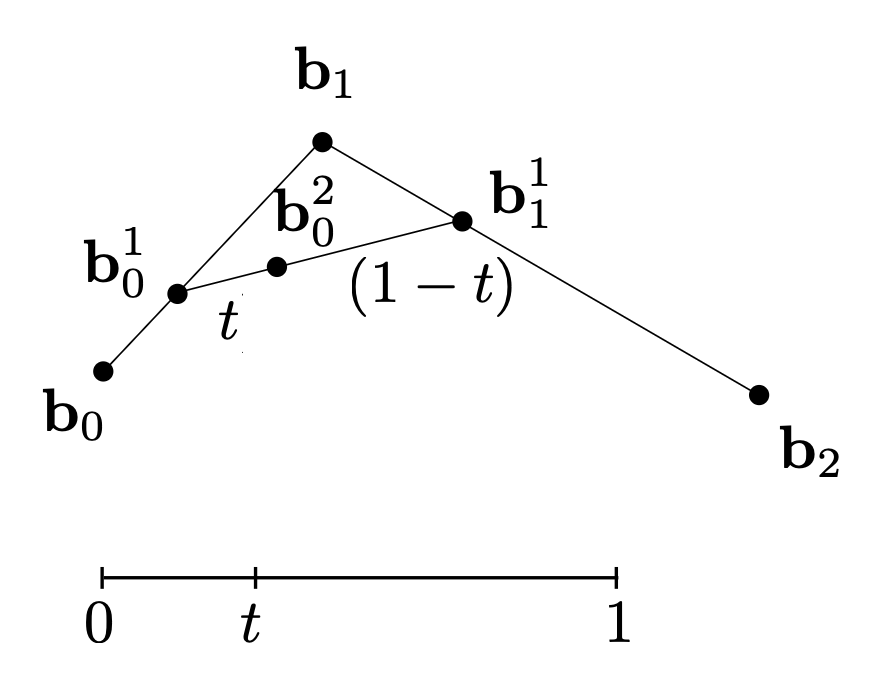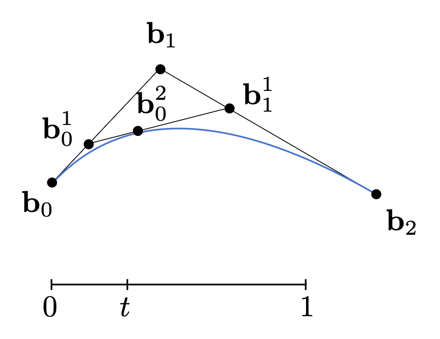 根据已知的控制点找出贝塞尔曲线的算法是德卡斯特里奥算法(De Casteljau Algorithm)。下面以二次贝塞尔曲线为例介绍如何求解: