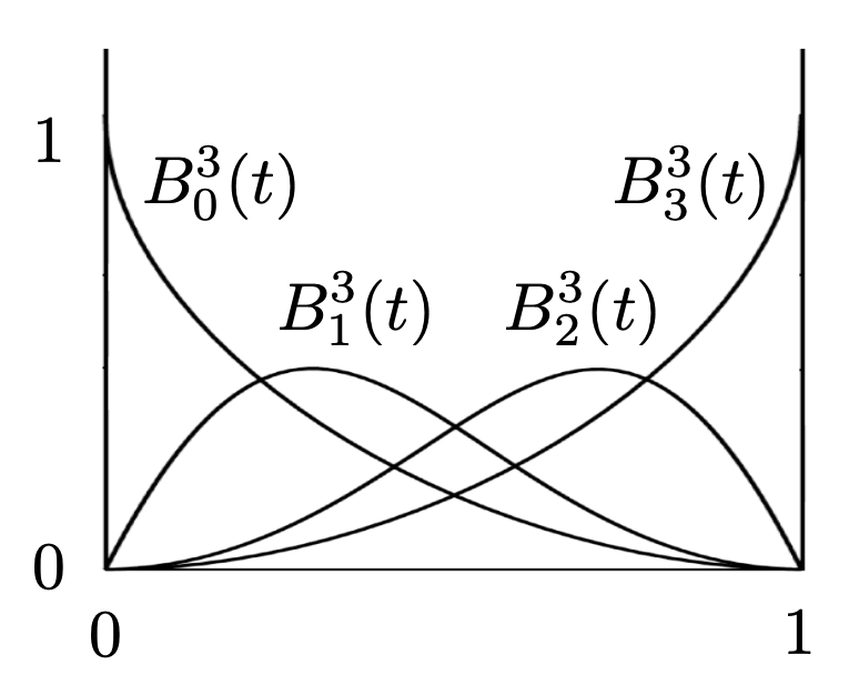 这些点定义了一条三次贝塞尔曲线,它是一个关于 \(t\) 的三次多项式: $$ \bm{b}^n (t) = \bm{b}_0 (1 - t)^3 + \bm{b}_1 3t(1 - t)^2 + \bm{b}_2 3t^2 (1 - t) + \bm{b}_3 t^3 $$