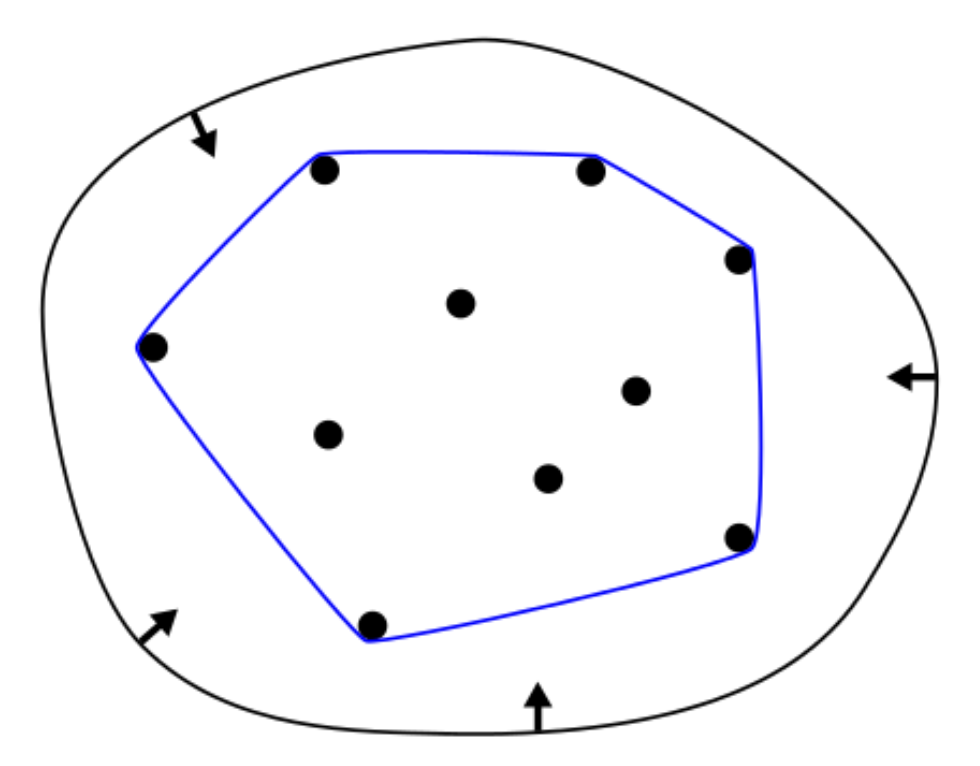 ) ,现在用一根橡皮筋包住这些钉子——先将橡皮筋拉大,覆盖所有的钉子,然后松手,皮筋收紧时也能包住所有的点,此时这根皮筋就是这组钉子的凸包