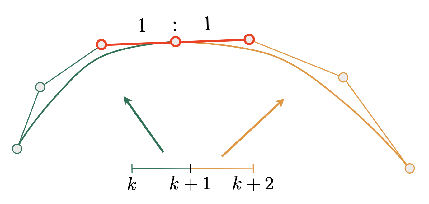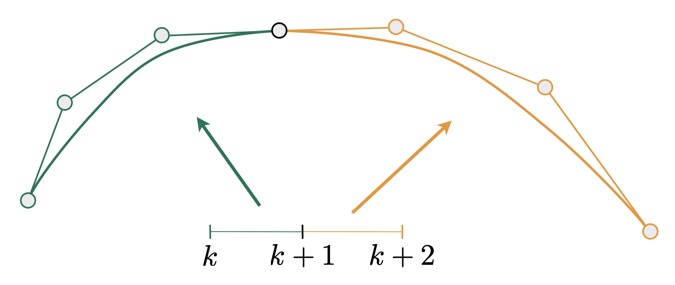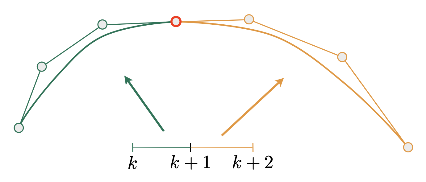 假设两条相邻的贝塞尔曲线为:\(\mathbf{a}: [k, k+1] \rightarrow \mathbb{R}^N, \mathbf{b}: [k+1, k+2] \rightarrow \mathbb{R}^N\)(整数的划分