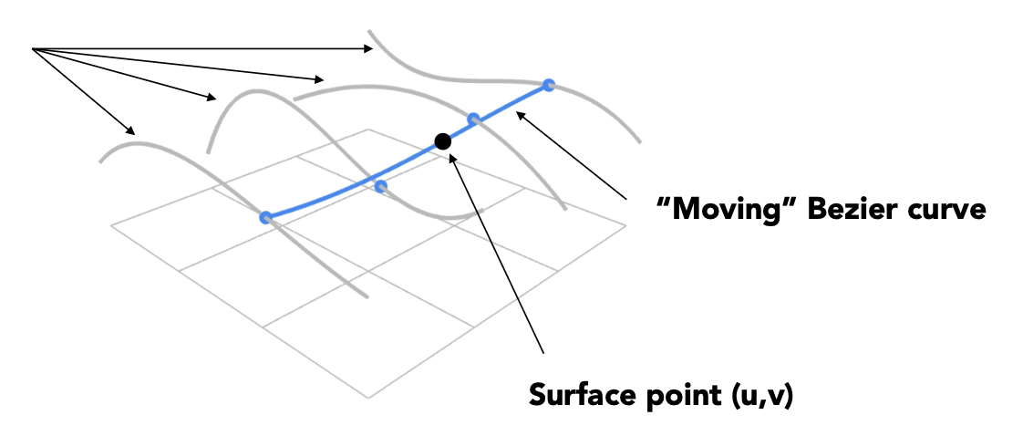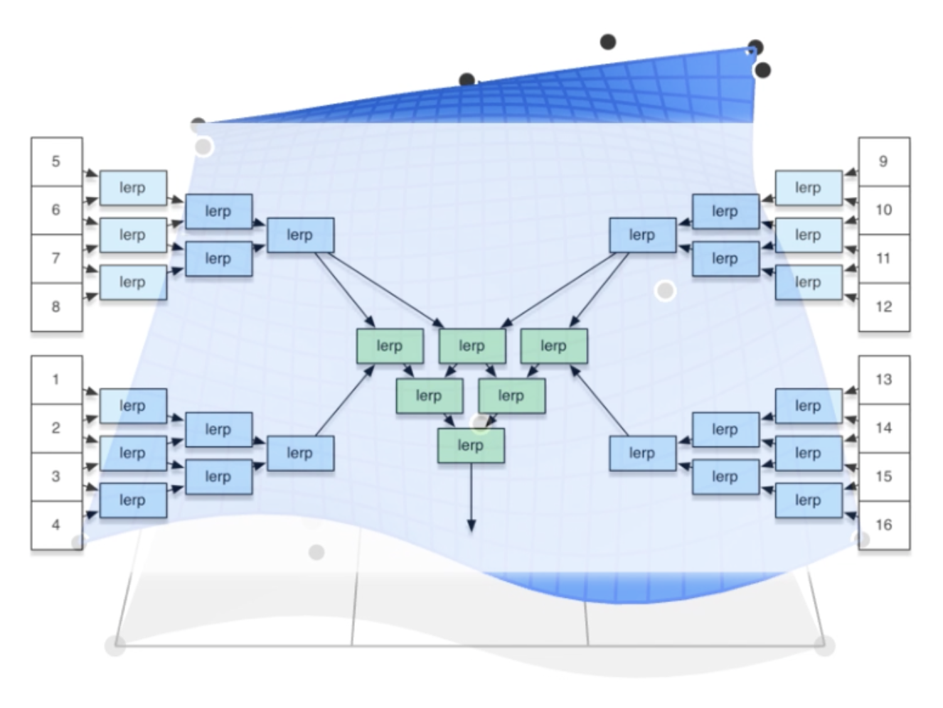 贝塞尔曲面的求解方法是使用可分离的一维德卡斯特里奥算法(separable 1D De Casteljau algorithm)。