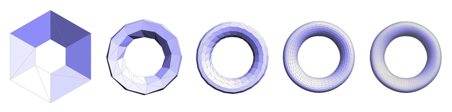 可以看到,每个非四边形会引入一个奇异点,并且经过一次细分后,非四边形面就会消失。下面两张图是继续细分后的结果:
