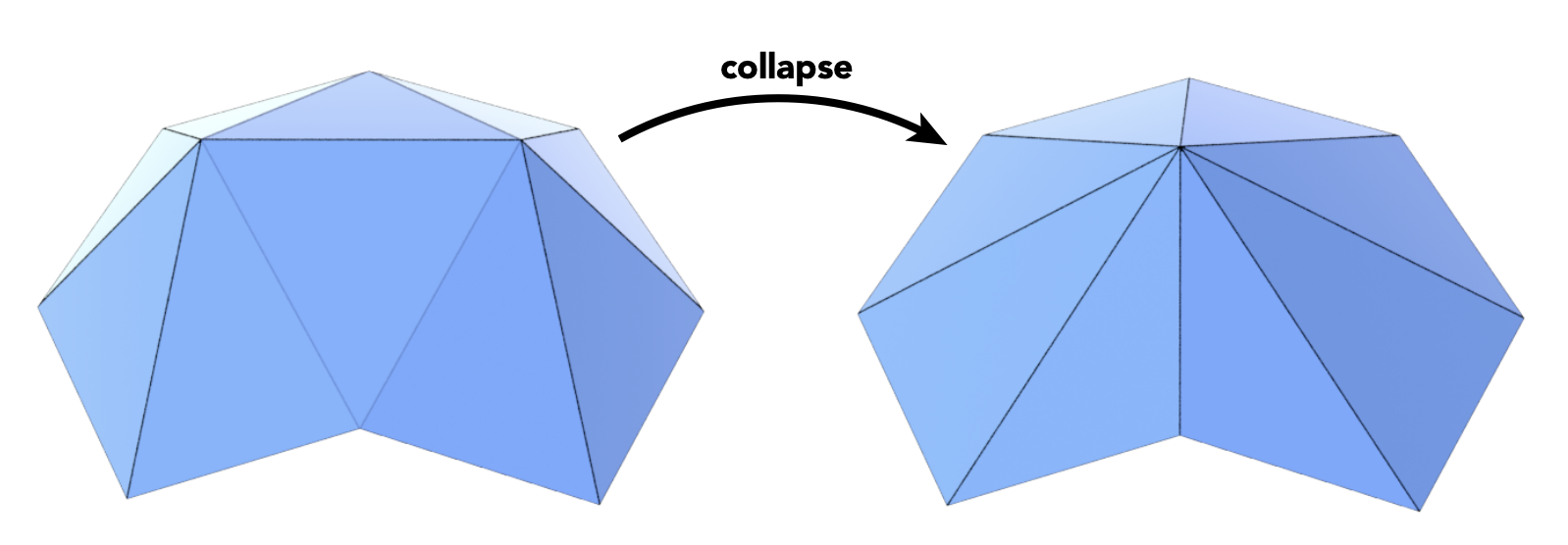简化的管教操作是边坍缩(edge collapsing),也就是将多个顶点汇聚成一个顶点(这样操作后就会删去一些边