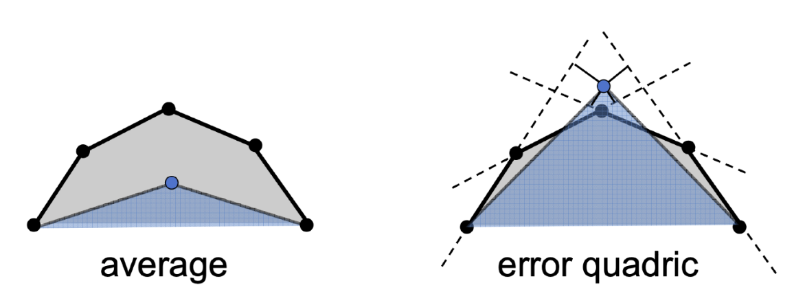 - 二次误差:新生成的顶点需要最小化该点到之前几个相关三角形面距离的平方和(L2 距离)