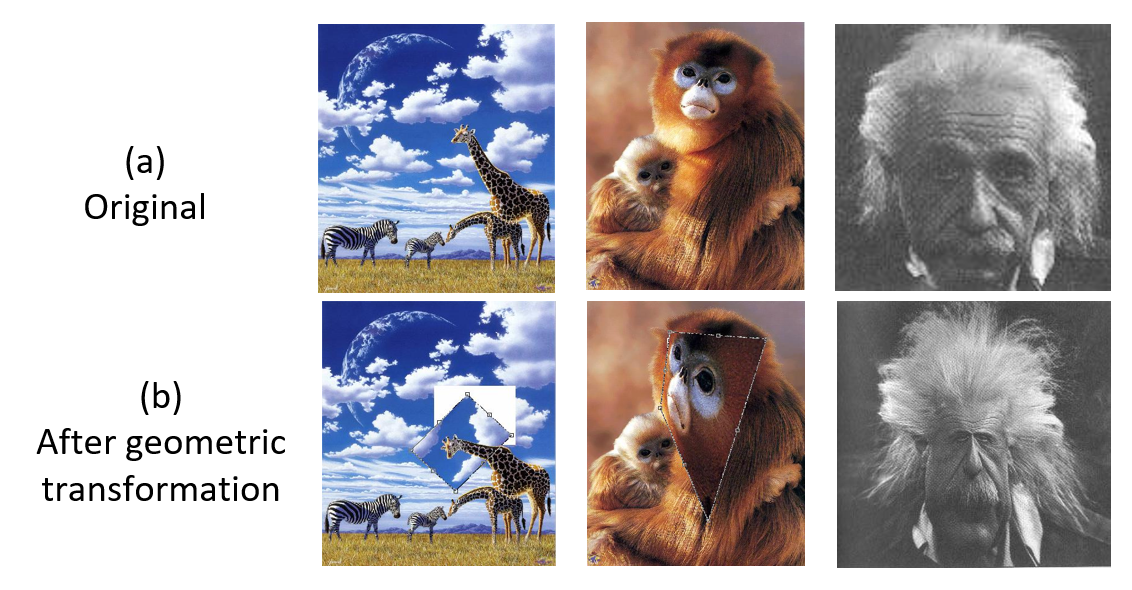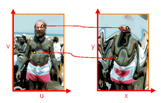 其中 \(f(x, y)\) 表示输入图像,\(g(x, y)\) 表示输出图像,函数 \(a(x, y), b(x, y)\) 唯一地描述了空间变换。