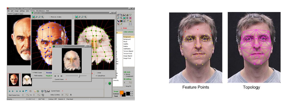 • 在原图上标出一些特征点,用于勾画起始帧和结束帧的结构对应关系,并将这些点连接起来,得到了一些线段 (segment)。特征点是变形运算所需的参数