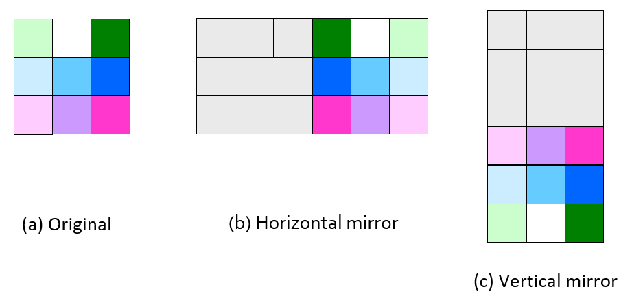 镜像(mirror):将图像绕 \(x\) 轴或 \(y\) 轴翻转,从而产生与原图像对称的新图像的过程。它的方程为: