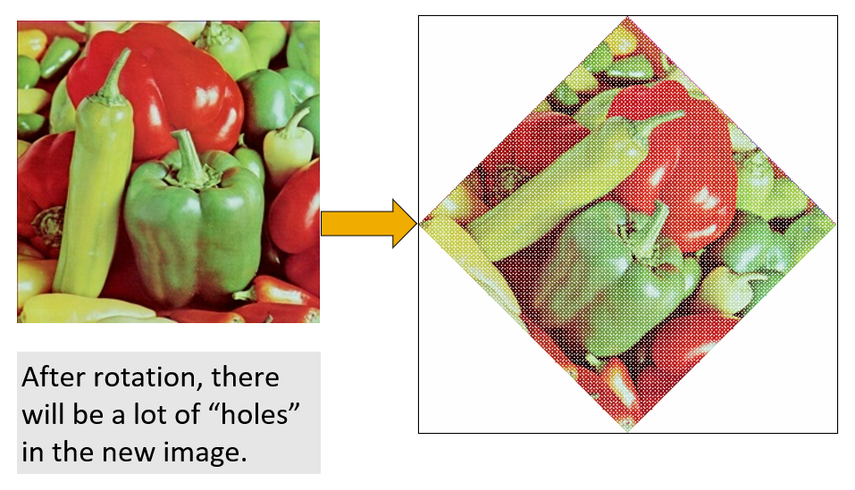 图像经过旋转变换以后,新图像中会出现许多空洞,如下图所示: