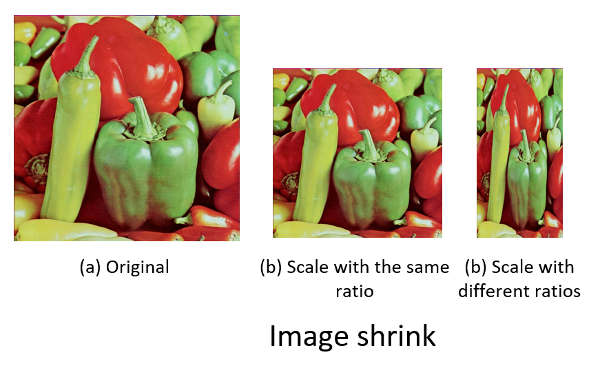 • 缩小(shrink):按一定间隔选取某些行和列的像素构成缩小后的新图像