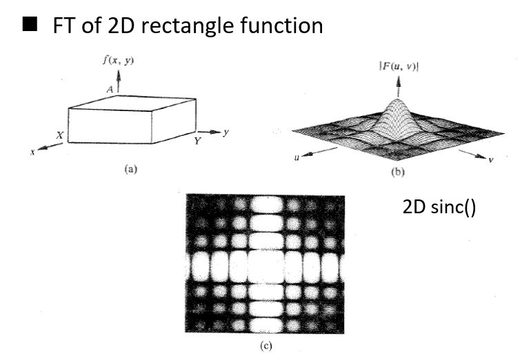 - 逆 FT:\(F^{-1}(F(u, v)) = f(x, y) = \int_{-\infty}^{\infty} \int_{-\infty}^{\infty} F(u, v) e^{\bm{j} 2\pi (ux + vy)} \text{d}u\text{d}v\)