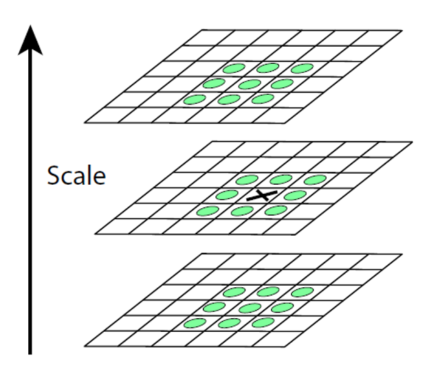 局部极值检测(local extrama detection):将图像的某个像素点与它在三个尺度上的 26 个邻居像素点进行比较。