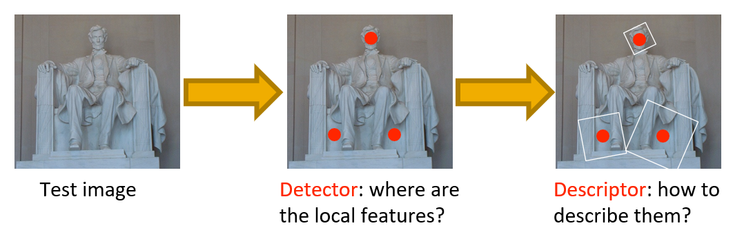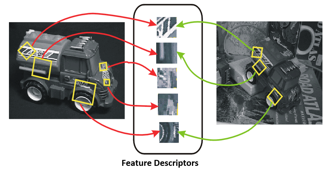 假设我们比较图像 \(I_1\) 和 \(I_2\),且 \(I_2\) 是 \(I_1\) 变换版本。无论它们之间发生何种变换,我们希望找到这两幅图相同的特征点,这称为变换不变性(transformational invariance)。有很多的特征方法可以处理平移、二维旋转、尺度等变换的不变性,甚至可以处理局部的三维旋转、仿射变换、亮度 / 对比度改变等。