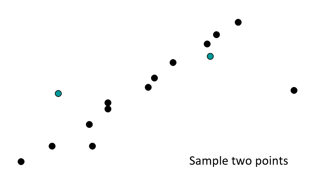 ) ,需要 \(n\) 个用于定义假设的点(即单次采样的最小样本点数,直线需要两个点) ,进行 \(k\) 次采样 - 可能对 \(n\) 个点的单次采样就是正确的:\(w^n\)
